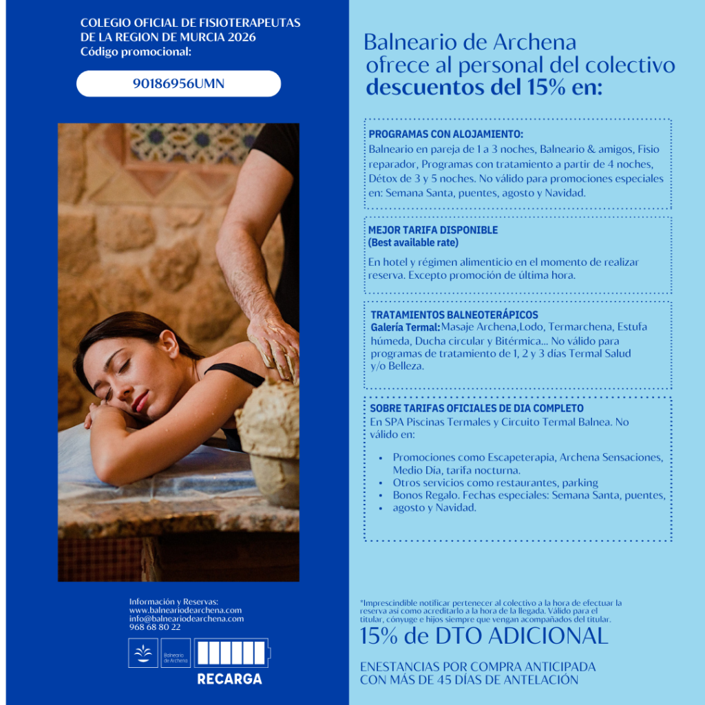 El balneario de Archena ofrece a todo el colectivo un descuento del 15% en programas de alojamiento, sobre la mejor tarifa disponible (en hotel y régimen alimenticio a la hora de realizar la reserva), en tratamientos balneoterápicos y sobre tarifas oficiales de días completos.