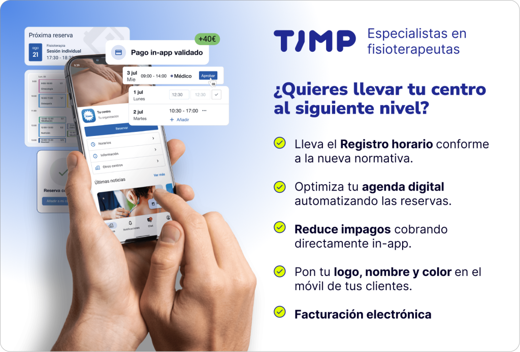 Somos TIMP, el software de gestión y app de reservas especializado en fisioterapeutas nº1 en España.