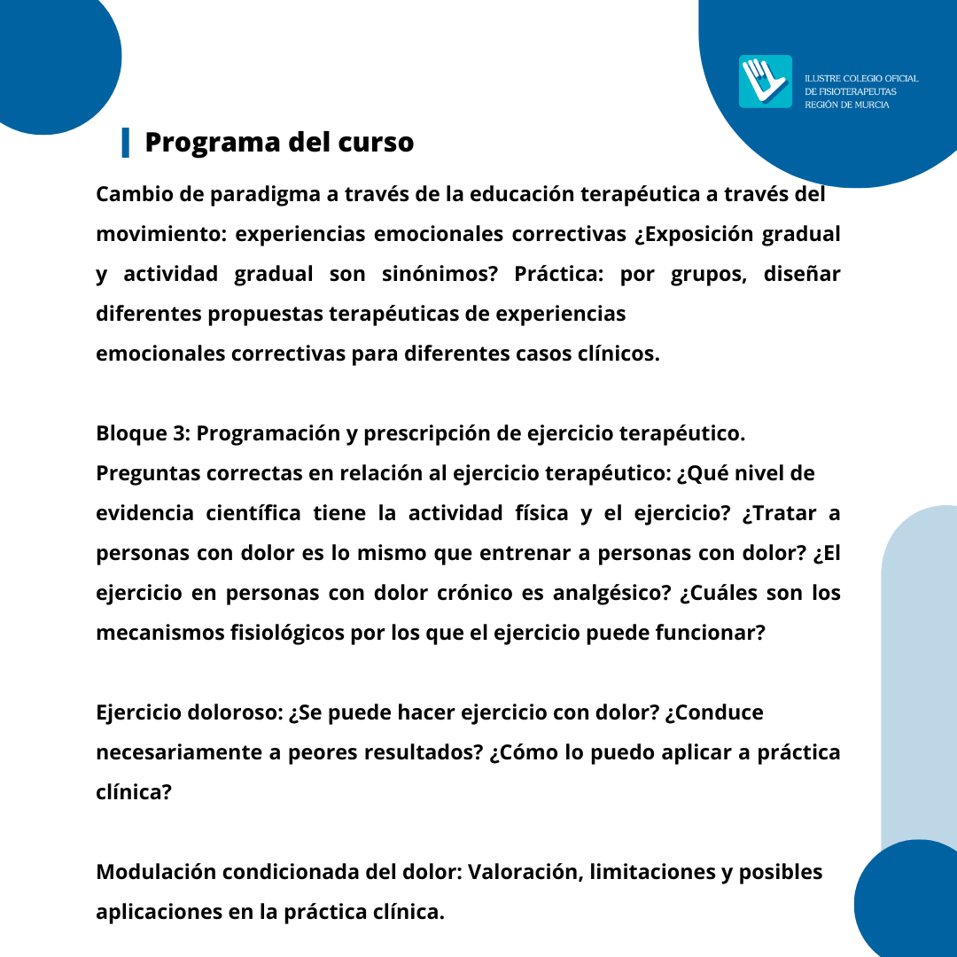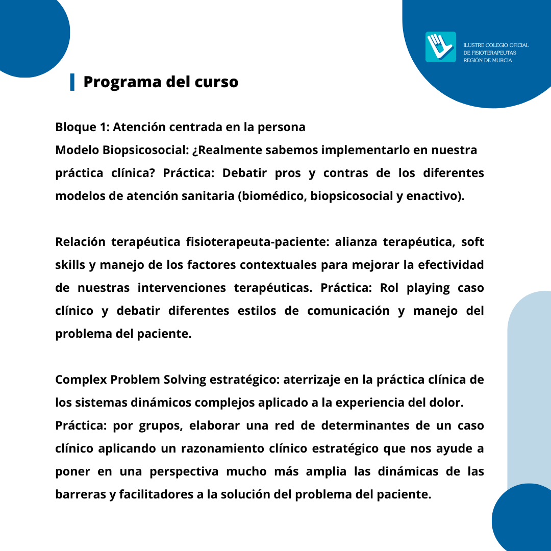 Docente en diferentes másters y formaciones postgrado, y ha sido ponente en congresos a nivel nacional e internacional relacionados con el abordaje biopsicosocial del dolor, la