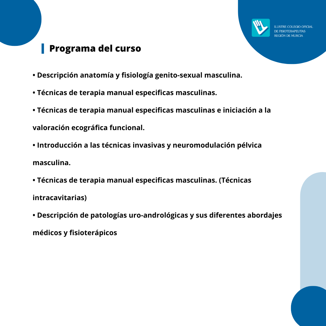 Lugar: Aula de Formación del Ilustre Colegio Oficial de Fisioterapeutas de la Región de Murcia (C/ María Guerrero, nº 13-bajo) / 30002-Murcia.